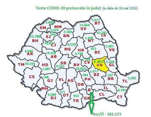 La trei luni de la primul caz de COVID-19 înregistrat în țara noastră (26 februarie a. c. ), au fost prelucrate la nivel național aproape 500.000 de teste moleculare prin metoda Real Time PCR. Într-un clasament pe județe la numărul de teste efectuate, Vrancea se situează pe un rezonabil loc 17, având înregistrate 4463 de teste (potrivit datelor oficiale raportate până pe 29 mai).
