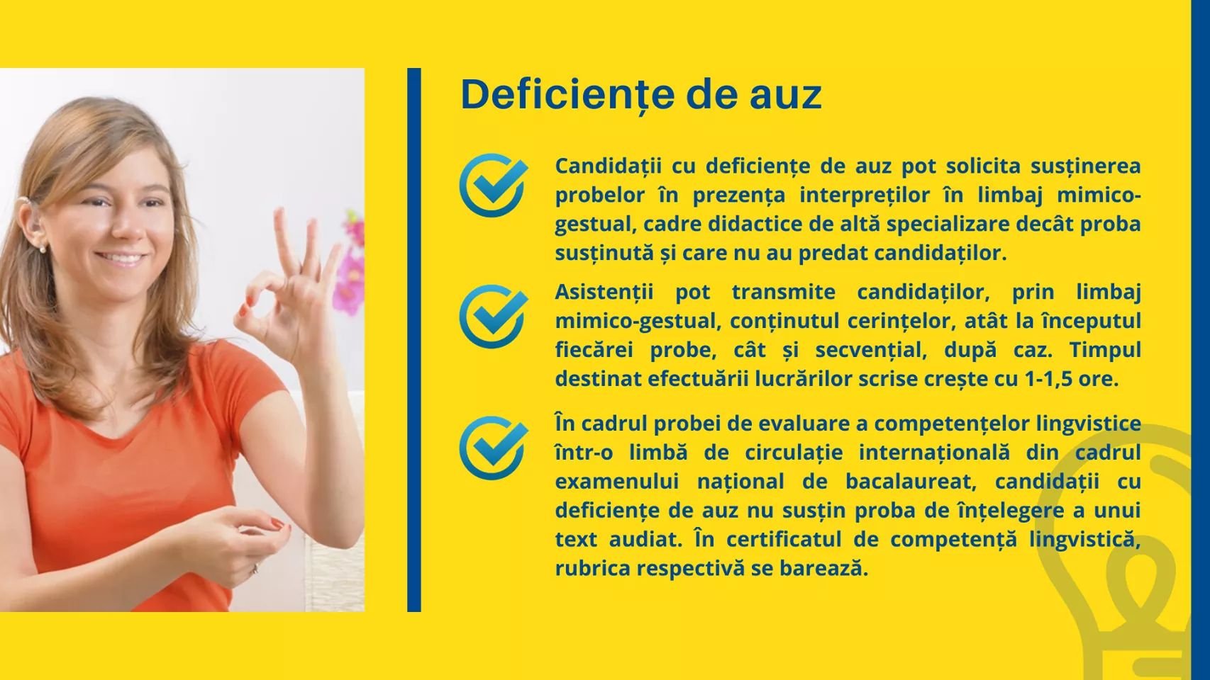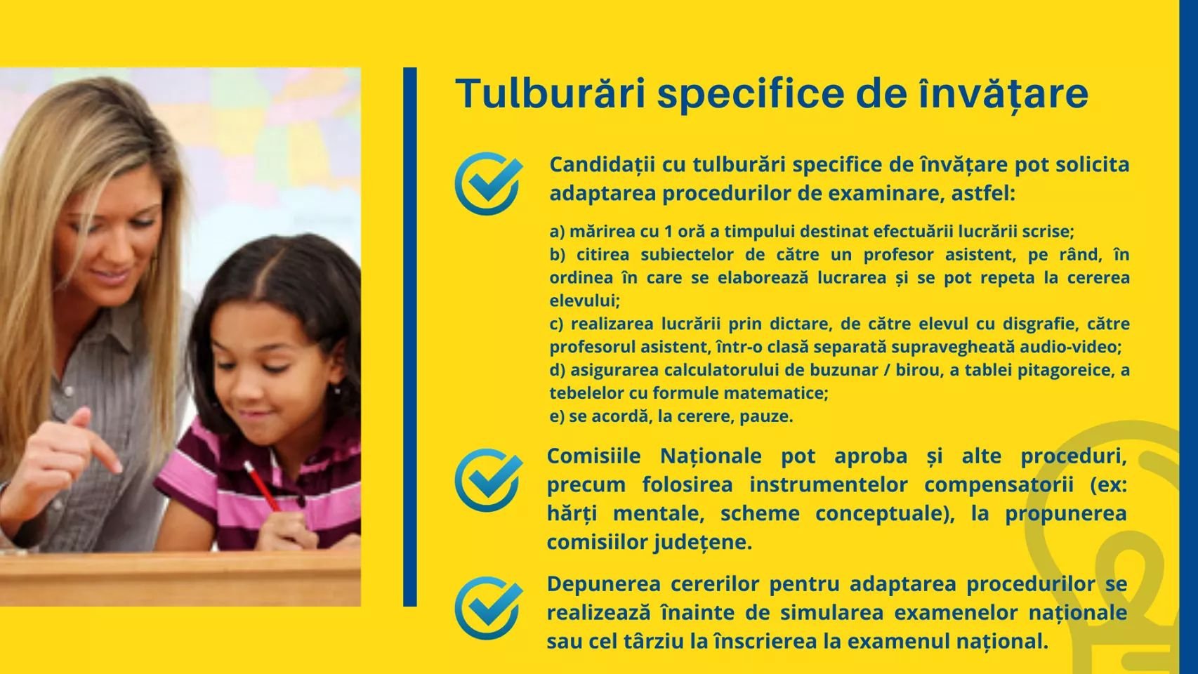 În întâmpinarea elevilor cu deficiențe de vedere/auz/tulburări de spectru autist/tulburări specifice de învățare, Ministerul Educației și Cercetării a publicat un ghid informativ privind principalele proceduri de examen și potențialele adaptări pentru acești candidați.
