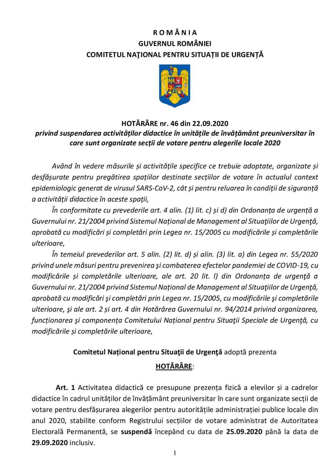 Activitatea didactică ce presupune prezența fizică a elevilor și a cadrelor didactice în cadrul unităților de învățământ preuniversitar în care sunt organizate secții de votare pentru desfășurarea alegerilor din data de 27 septembrie 2020 SE SUSPENDĂ ÎN ZILELE DE 25, 28 ȘI 29 SEPTEMBRIE 2020.