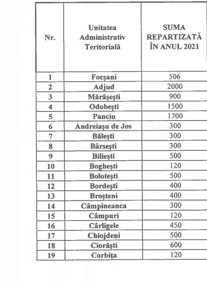 Foto : Alocarea sumelor pe localitățile din județul Vrancea. Sumele reprezintă mii lei.
