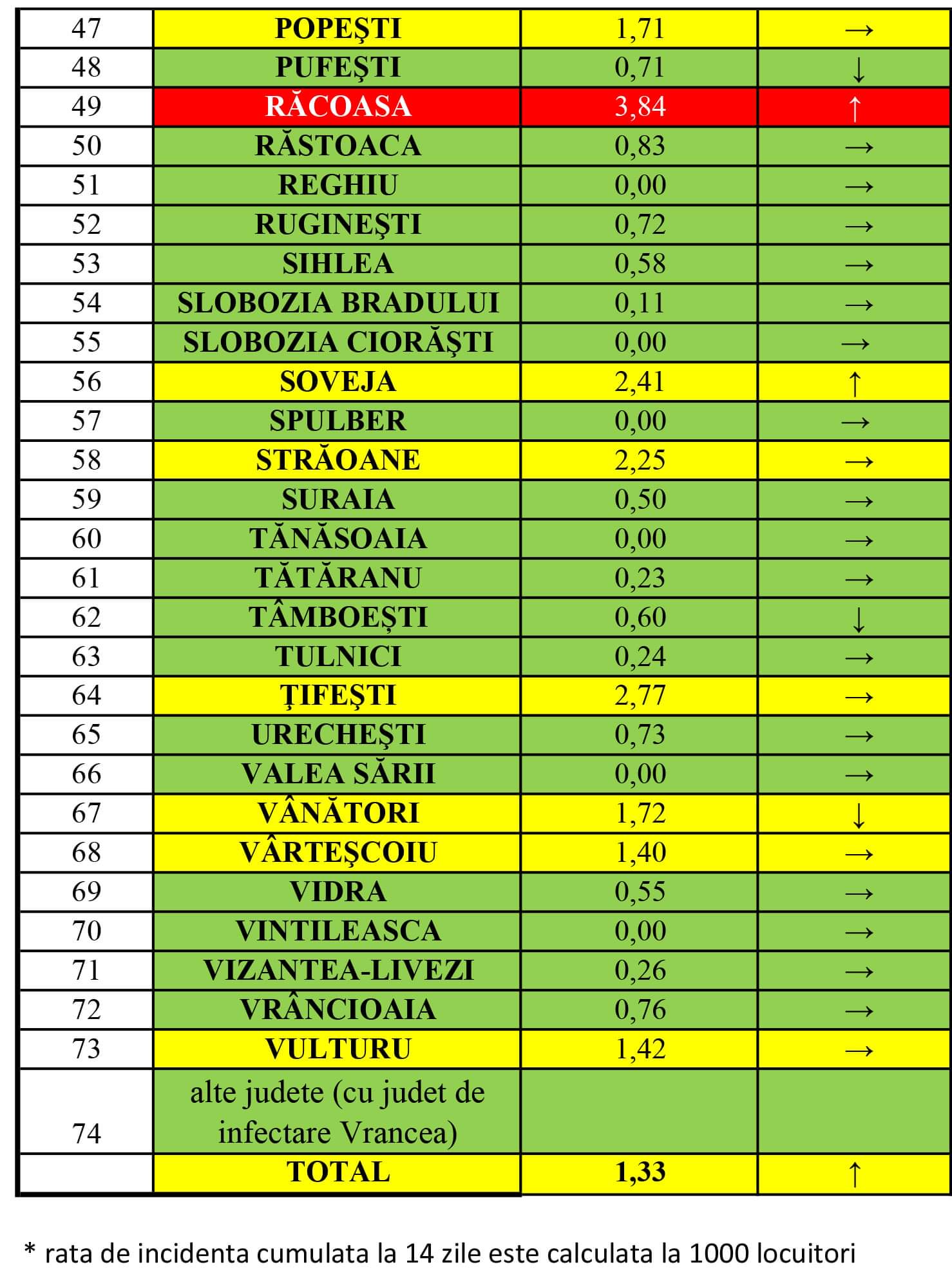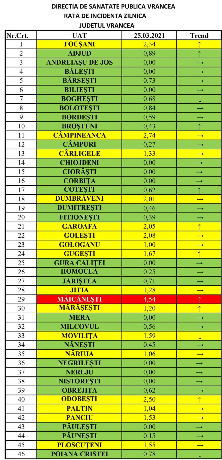 Direcția de Sănătate Publică Vrancea a întocmit tabelul cu valorile ratei de incidență a infectării cu COVID-19 în județ, valabile pentru ziua de 25 martie 2021. Rata de infectare pentru Vrancea are valoarea de 1,33‰, în creștere.