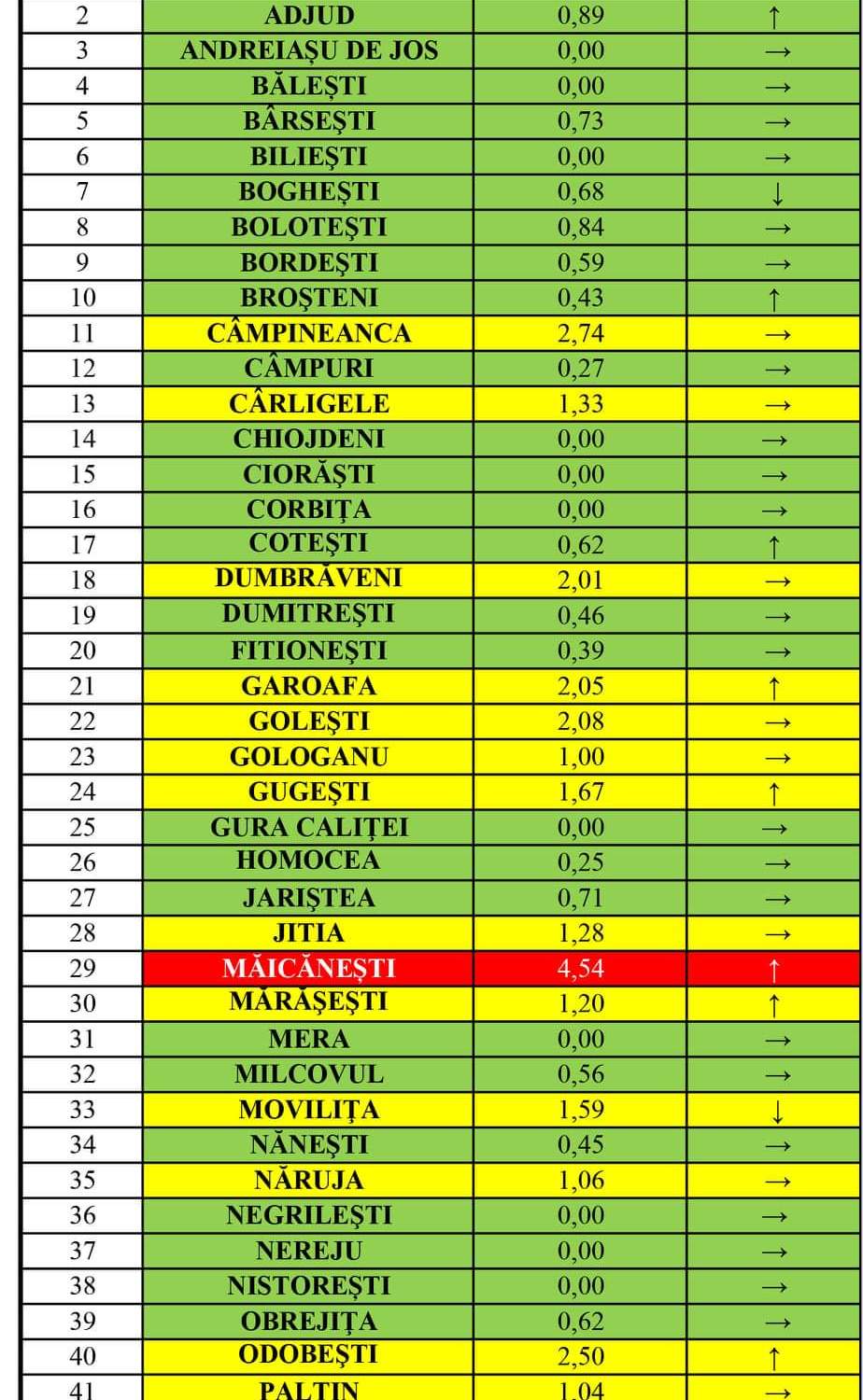 Localități cu rate de infectare peste 3‰: Măicănești – 4,54 în creștere, Răcoasa – 3,84 în creștere.