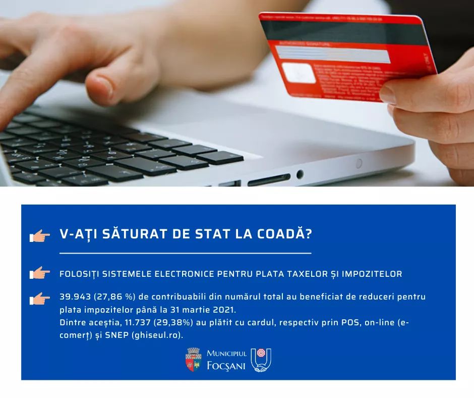 Primăria Focşani anunţă că 39.943 (27,86 %) de contribuabili din numărul total au beneficiat de reducerile legale, ca urmare a faptului că au plătit impozitele la data de 31 martie 2021.