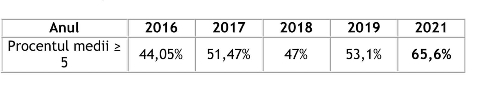 Centralizarea datelor comunicate de inspectoratele școlare județene relevă următoarele rezultate – procentul notelor mai mari sau egale cu 5: