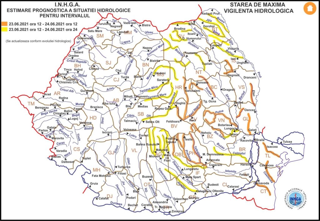 Institutul Național de Hidrologie și Gospodărire a Apelor (INHGA) a prelungit și extins, pentru încă 24 de ore, codul portocaliu pentru râurile din bazinele hidrografice, unde pot fi depășite cotele de inundație: