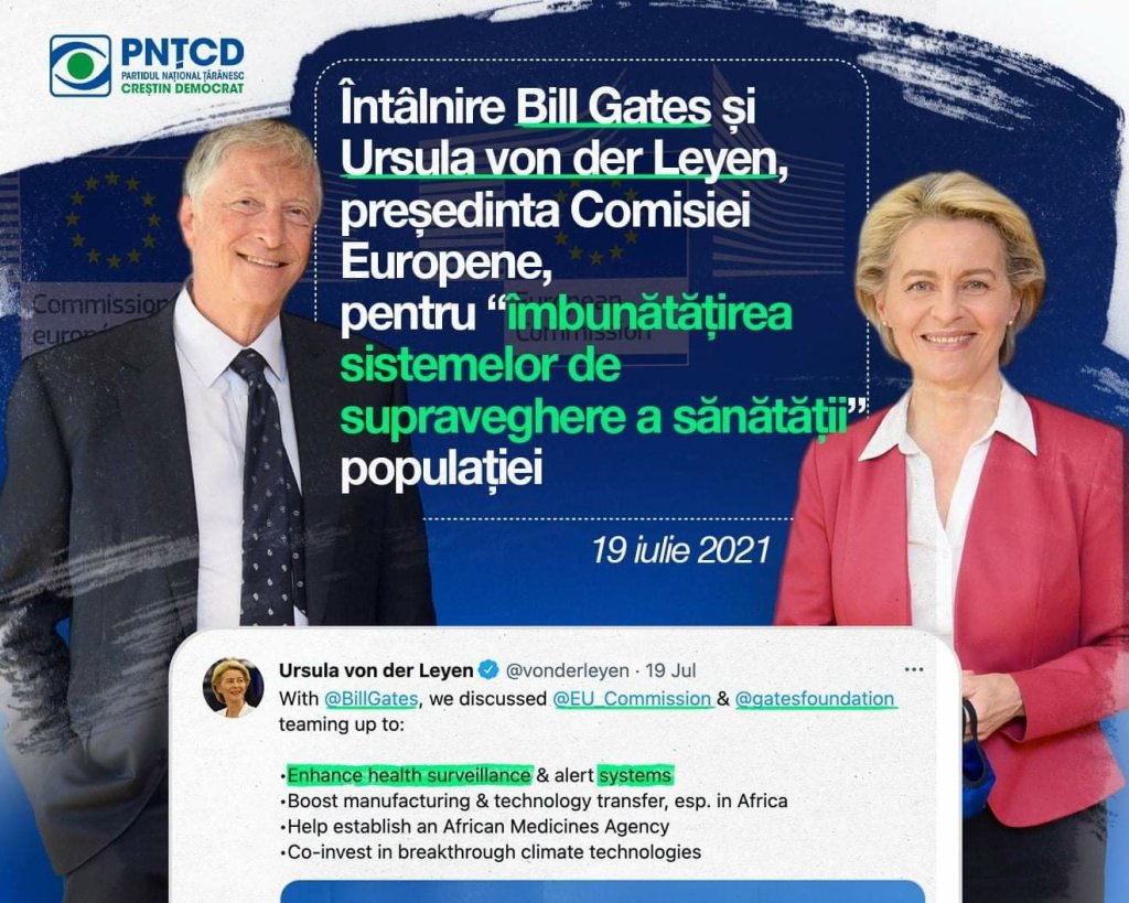 Ursula von der Leyen, presedinta Comisiei Europene, s-a intalnit cu Bill Gates pentru a discuta, printre altele, despre „imbunatatirea sistemelor de supraveghere a sanatatii si alertarii” populatiei, a anuntat aceasta pe Twitter pe data de 19 iulie 2021.