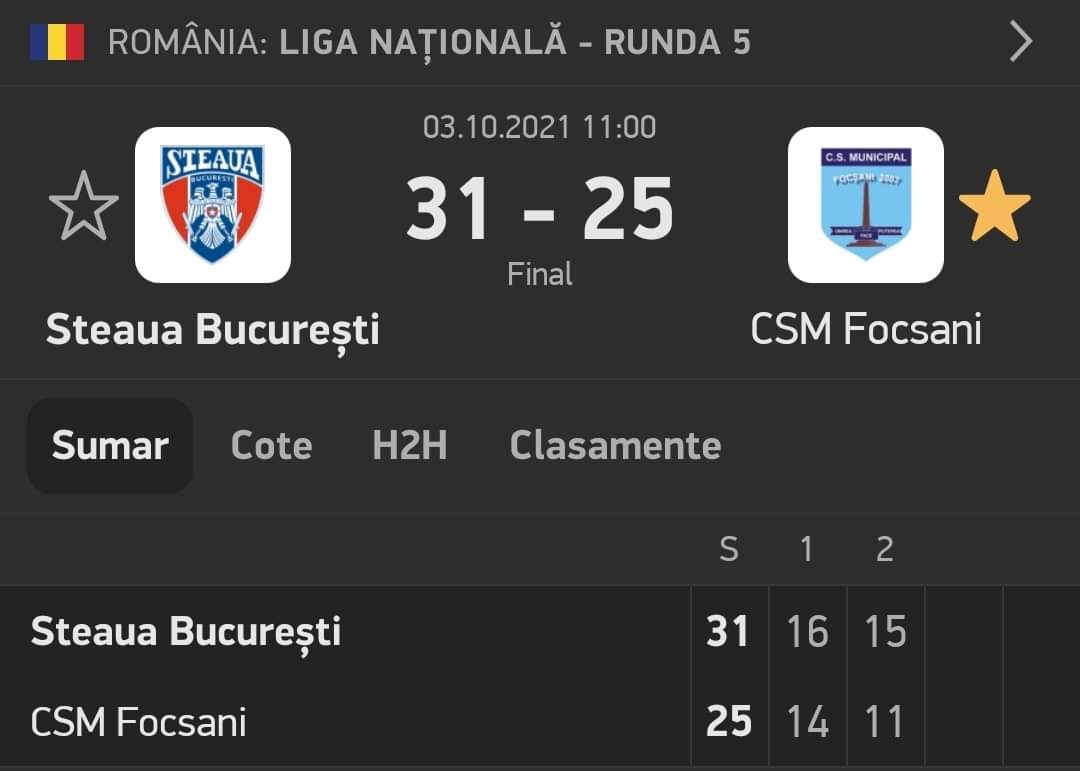 Astăzi, CSM FOCŞANI 2007, au avut meci de la ora 11:00, în deplasare cu Steaua București. Cum sala din Chiajna, locul unde s-a disputat partida, nu a primit avizele necesare din partea ISU, din cauza ratei crescute a infecției cu Covid – 19, partida s-a disputat fără spectatori. Meciul a fost transmis în direct, pe TVR 2.