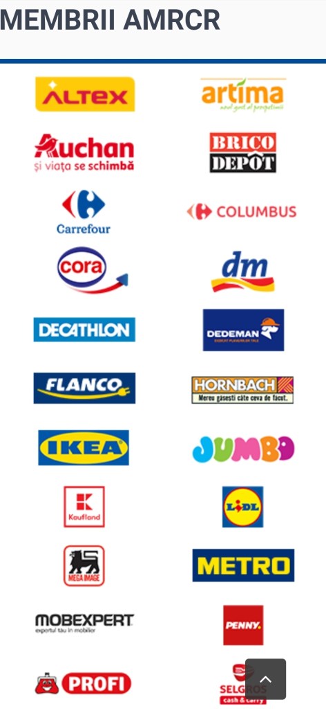Asociația Marilor Rețele Comerciale include 22 de retaileri alimentari și nealimentari: Altex, Artima, Auchan, Brico Depot, Carrefour, Columbus, Cora, DM Drogerie Markt, Decathlon, Dedeman, Flanco, Hornbach, Ikea, Jumbo, Kaufland, Lidl, Mega Image, Metro Cash & Carry, Mobexpert, Penny, Profi, Selgros.