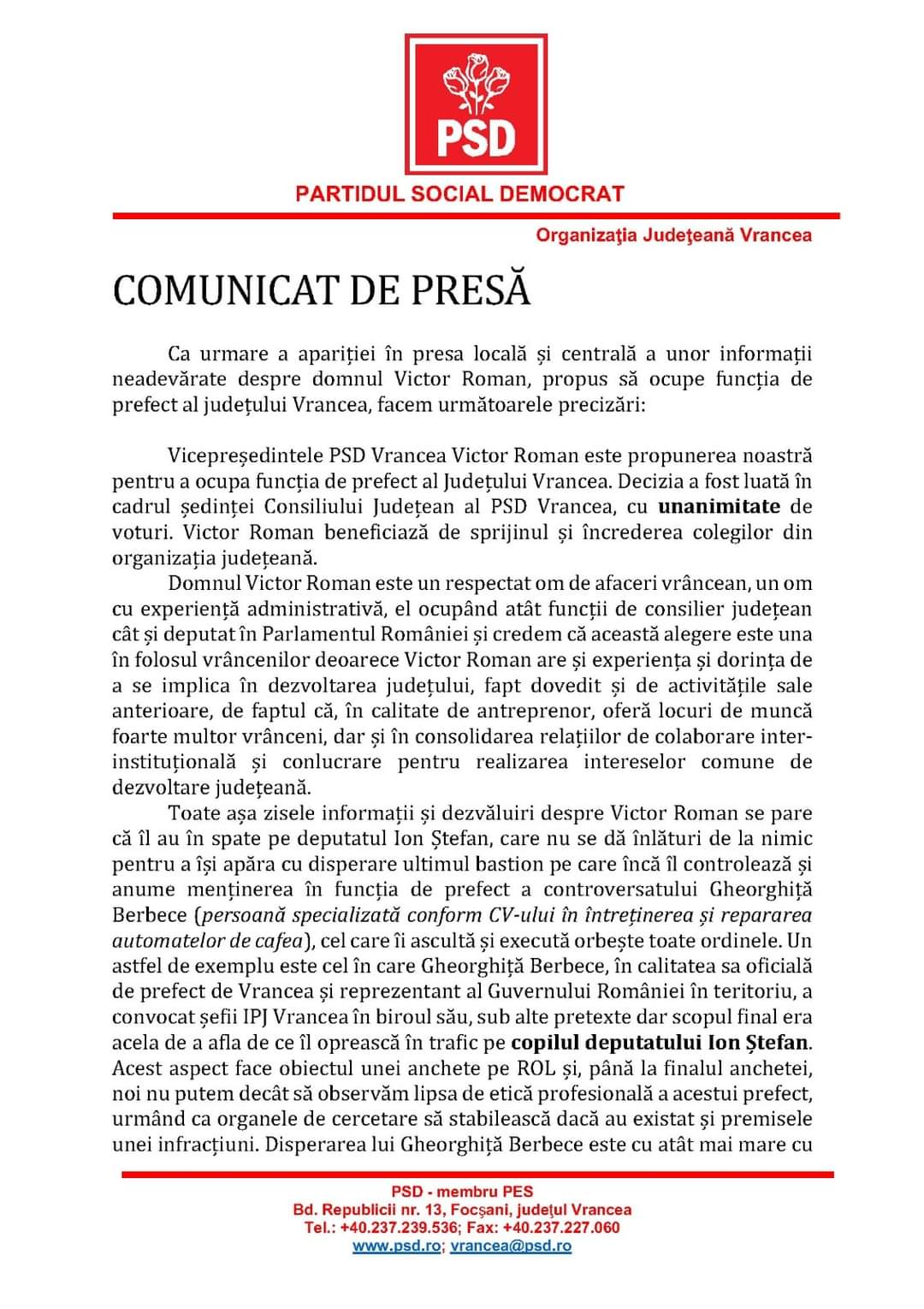 Vicepreședintele PSD Vrancea, Victor Roman, este propunerea noastră pentru a ocupa funcția de prefect al Județului Vrancea. Decizia a fost luată în cadrul ședinței Consiliului Județean al PSD Vrancea, cu unanimitate de voturi.