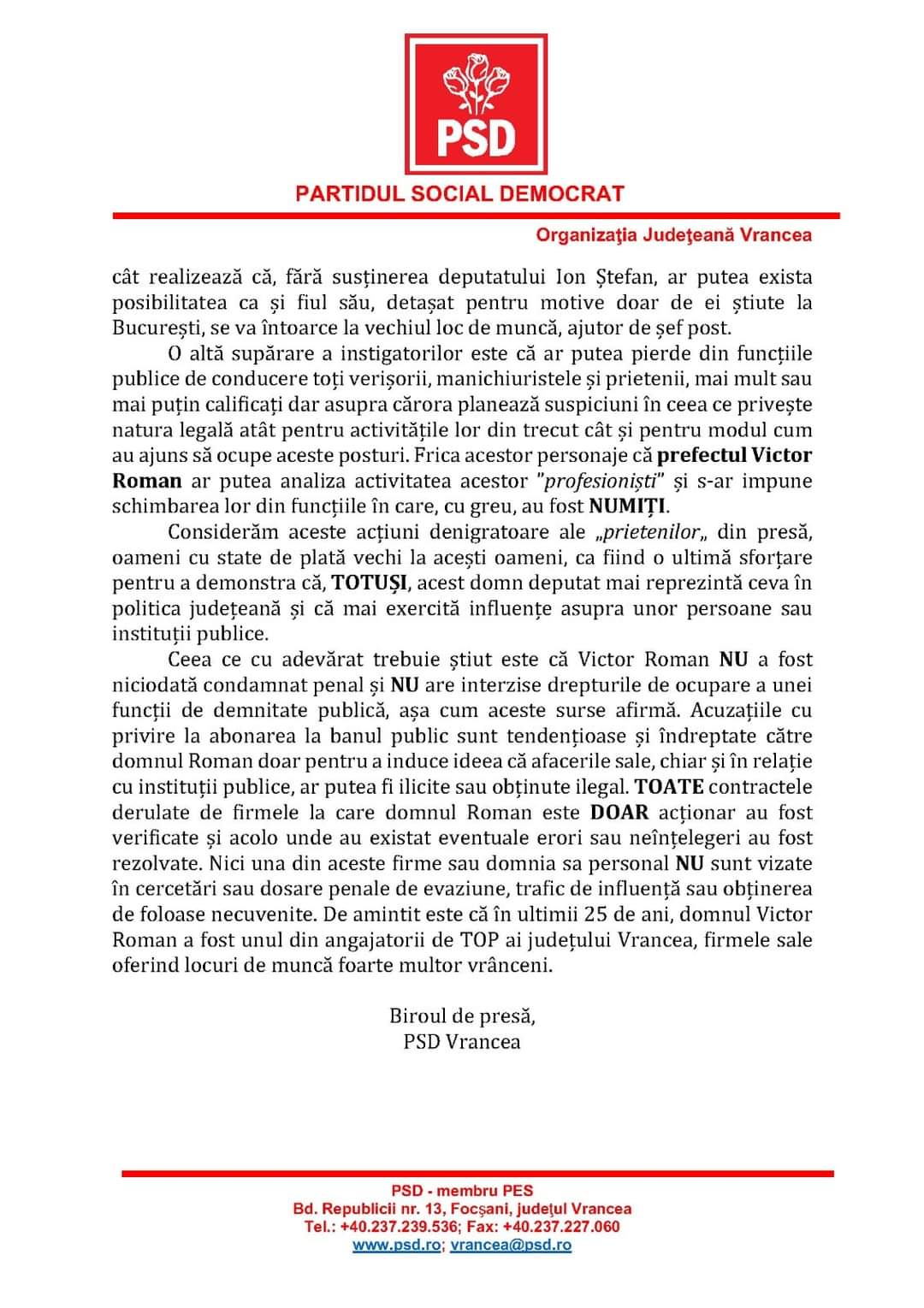 Ca urmare a apariției în presa locală și centrală a unor informații neadevărate despre domnul Victor Roman, propus să ocupe funcția de prefect al județului Vrancea, facem următoarele precizări: