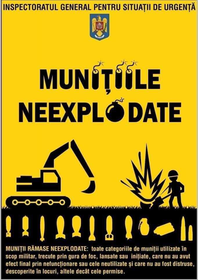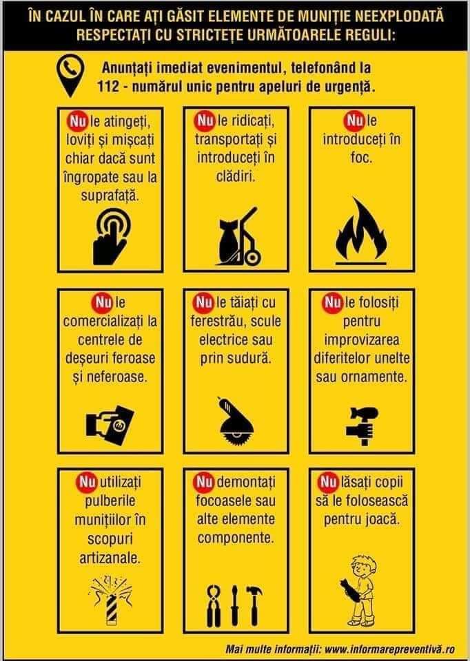 Cu această ocazie, reamintim cetăţenilor că la descoperirea muniţiei rămase neexplodate au obligația să informeze serviciile de urgenţă profesioniste sau poliţia, după caz, telefonic, prin apelarea numărului de urgenţă 112. Pentru a evita producerea unor evenimente cu urmări tragice, care se pot solda cu răniri grave ori cu pierderi de vieţi omeneşti, în momentul găsirii elementelor de muniţie neexplodate, Se interzice: