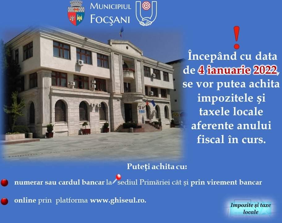 Primăria Municipiului Focşani aduce la cunoştinţa persoanelor fizice și juridice că, începând cu data de 4 ianuarie 2022, se vor putea achita impozitele și taxele locale aferente anului fiscal în curs. Acestea se pot achita cu numerar sau cardul bancar la sediul Primăriei Municipiului Focșani, cât și prin virament bancar și online prin platforma http://www.ghiseul.ro.