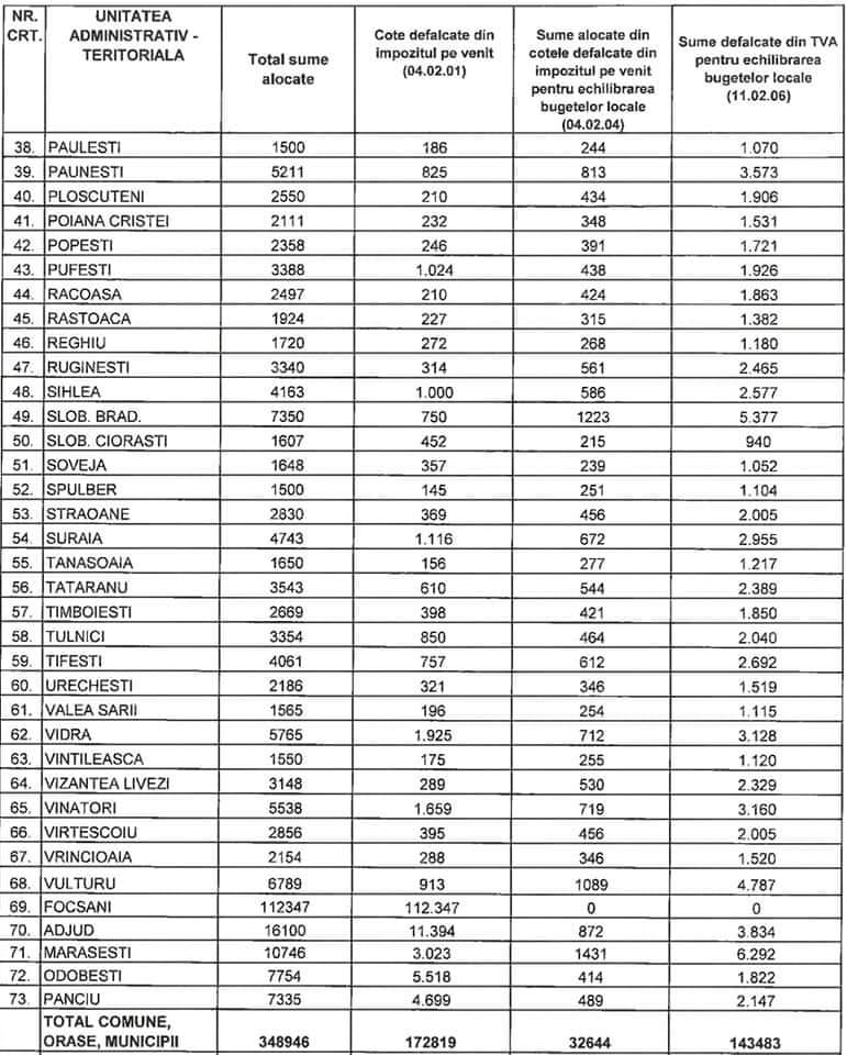 Agenția Națională de Administrare Fiscală a făcut publice sumele defalcate din taxa pe valoarea adaugată şi cotele defalcate din impozitul pe venit pentru echilibrarea bugetelor locale, în vederea elaborării şi fundamentării proiectelor de buget pe anul 2022 de către UAT-urile din Vrancea, sume pe care le regăsiți în fotografiile atașate.