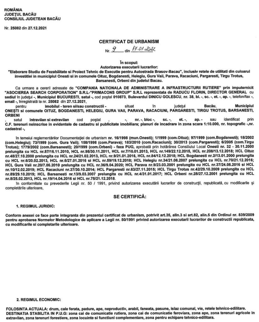 Consiliul Județean Bacău a eliberat astăzi, 17 Ianuarie 2022, certificatul de urbanism pentru Autostrada Bacău-Brașov A13.