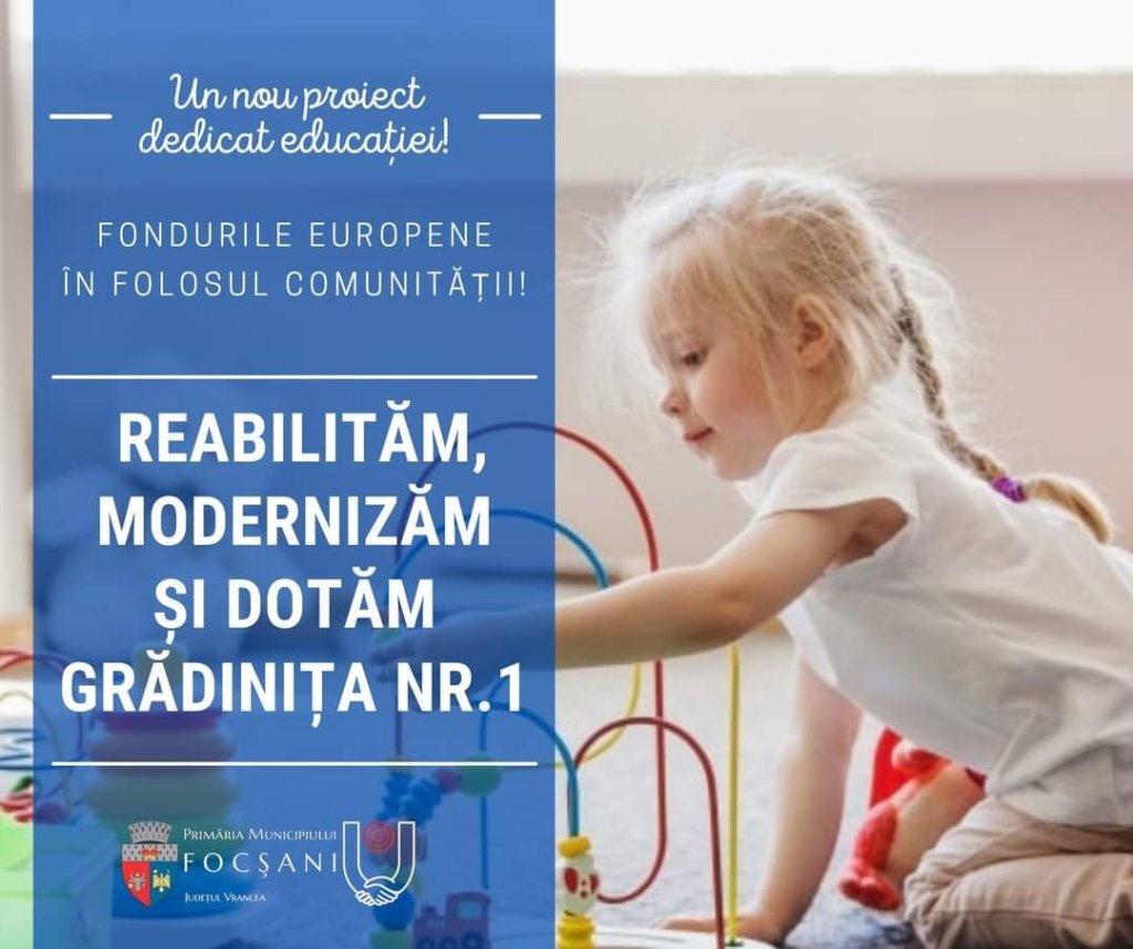 În data de 17.01.2022, UAT Municipiul Focşani a încheiat Contractul de Finanțare nr. 7.540 cu Ministerul Dezvoltării, Lucrărilor Publice și Administrației în vederea finanţării proiectului ”Reabilitarea, modernizarea și echiparea infrastructurii educaționale a Grădiniței nr.1”, Cod SMIS 149645.