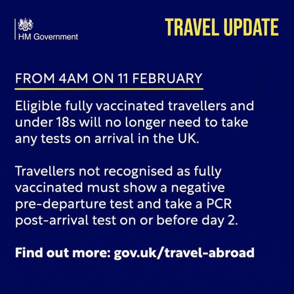 Începând de vineri, 11 februarie 2022, ora 4.00 GMT, persoanele vaccinate cu schema completă și copiii minori (sub 18 ani) NU trebuie să mai efectueze niciun fel de test Covid înainte sau după sosirea pe teritoriul Angliei.