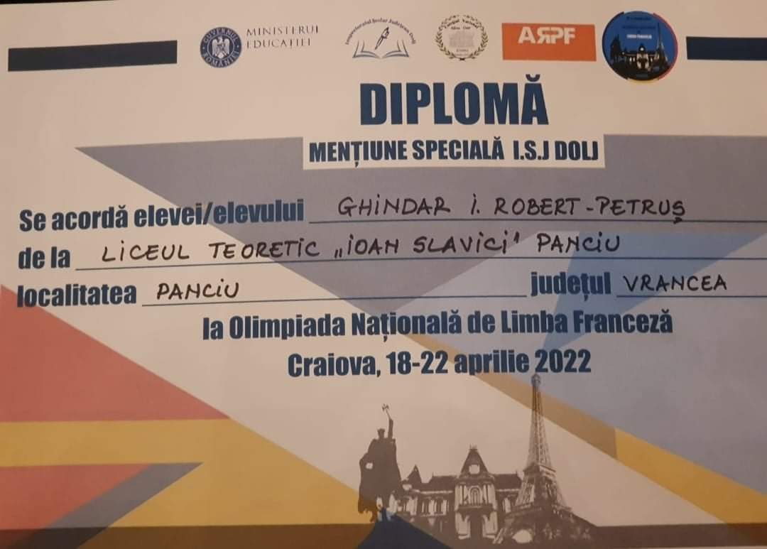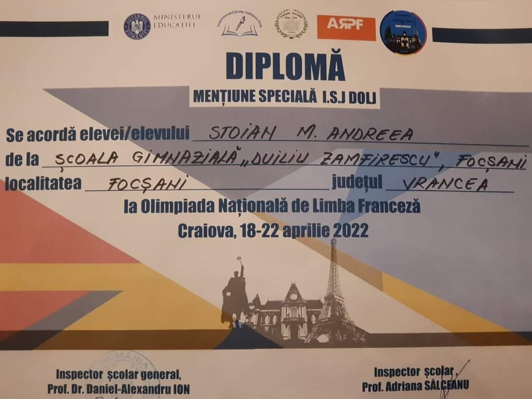 În acest an, Olimpiada Națională de Limbă Franceză s-a desfășurat la Craiova, în perioada 18-22.04.2022, (pentru clasele aVII-a- aXII-a). Strădania elevilor vrânceni a fost recompensată astfel :