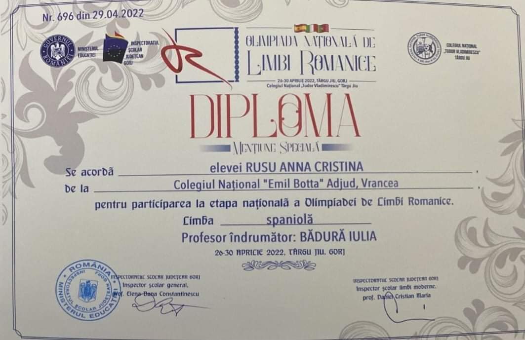 – RUSU ANNA CRISTINA, elevă în clasa a X-a la Colegiul Național «Emil Botta» Adjud, profesor îndrumător, doamna Iulia BĂDURĂ, a obținut MENŢIUNE SPECIALĂ ;