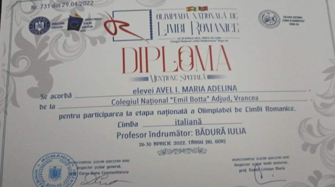 – AVEL MARIA ADELINA, elevă în clasa a X-a la Colegiul Național « Emil Botta » Adjud, profesor îndrumător, doamna Iulia BĂDURĂ, a obținut MENŢIUNE SPECIALĂ;