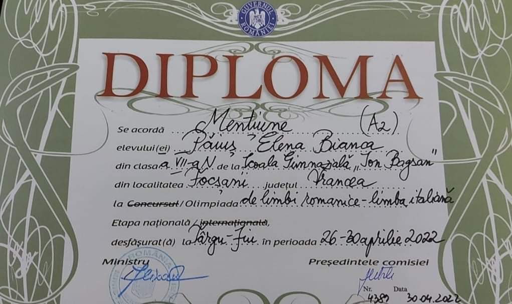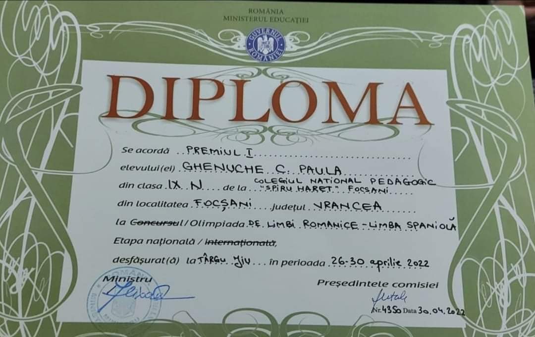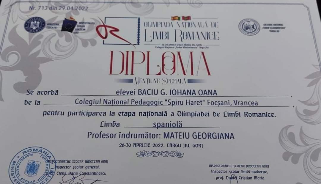 La Olimpiada Naţională de Limbi Romanice, care a avut loc la Târgu-Jiu, în perioada 26-30.04.2022, fiecare dintre cei cinci elevi, din Vrancea, a fost premiat.
