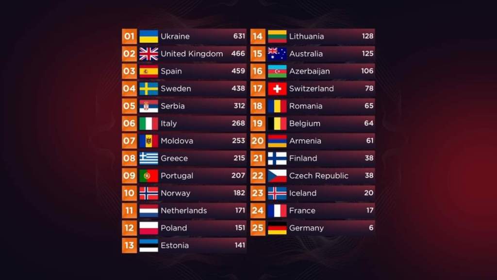 Aseară, 25 de țări au participat la Marea Finală a celui mai mare eveniment de muzică live din lume, găzduită de membrul italian EBU Rai, la Torino. Ivan Klymenko, Oleh Psiuk, Ihor Didenchuk, Tymofii Muzychuk și Vitalii Duzhyk au dat cântecul câștigător care a încheiat seara cu 631 de puncte, cu 165 de puncte în fața locului 2, Sam Ryder din Regatul Unit, care a cântat melodia „Space Man”. Chanel din Spania cu „SloMo” a terminat pe locul trei.