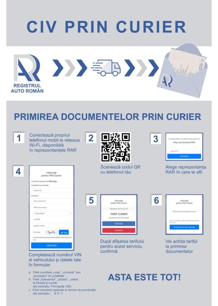 „Mai exact, când veniți cu autovehiculul la RAR, după identificare și verificare, puteți pleca fără să mai așteptați eliberarea actului (CIV). Îl veți primi prin curier, dacă solicitați acest lucru, în maximum 3 zile lucrătoare, termen care poate fi prelungit doar în situația excepțională în care emiterea CIV este condiționată de răspunsul altor entități externe. RAR NU taxează acest serviciu. Veți plăti doar taxa de curierat la primirea documentelor“.
