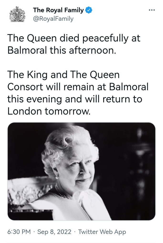 Regina a murit în pace la Balmoral în această după-amiază. Regele și Regina Consort vor rămâne la Balmoral în această seară și se vor întoarce la Londra mâine, anuntul a venit în aceasta dupa amiaza pe contul de Twitter al familiei Regale.