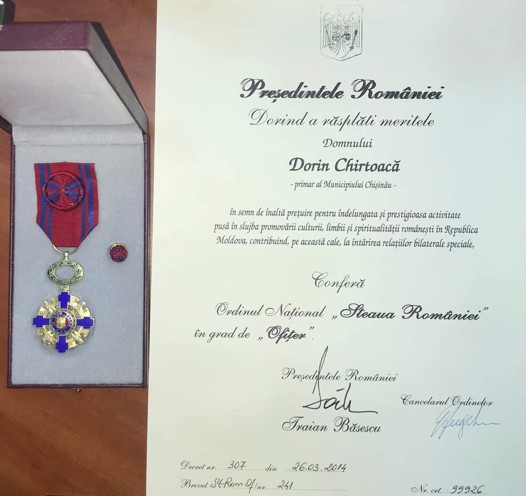 În semn de protest față de actul președintelui Iohannis care l-a decorat pe Marian Lupu cu ordinul Național „Steaua României” în grad de Comandor, Marian Lupu fiind președintele Curții de Conturi din Republica Moldova, Dorin Chirtoacă și-a depus decorația Ordinul Național “Steaua României”, in grad de Ofițer, brevetul și scrisoarea de însoțire la Ambasada României de la Chișinău.