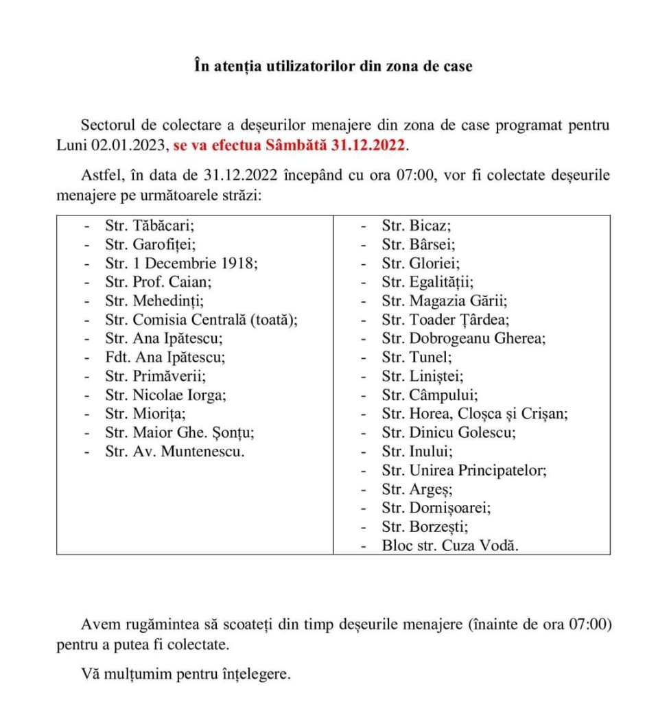 Sectorul de colectare a deșeurilor menajere din zona de case programat pentru Luni 02.01.2023, se va efectua Sâmbătă 31.12.2022. Strazile pot fi consultate mai jos.