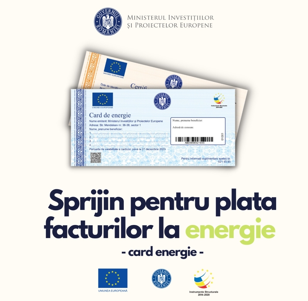 În 2023, MIPE oferă românilor vulnerabili, din fonduri europene, sprijin pentru plata facturilor la energie în valoare de 700 lei de 2 ori/ an. Cardurile pentru încasarea ajutoarelor vor fi emise și distribuite de Compania Națională Poșta Română, iar listele cu beneficiari vor fi întocmite de Ministerul Muncii și Solidarității Sociale.