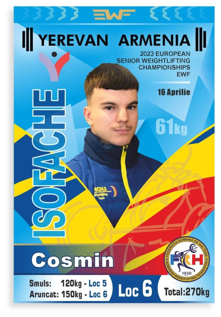 Concurs foarte bun cu 6 încercări reușite din 6 pentru tânărul Cosmin ISOFACHE în întrecerea categoriei 61 Kg. Sportivul nostru a obținut 2 locuri 6, la total și aruncat cu 270 Kg și 150 Kg şi o clasare pe locul 5, la stilul smuls, cu 120 Kg.