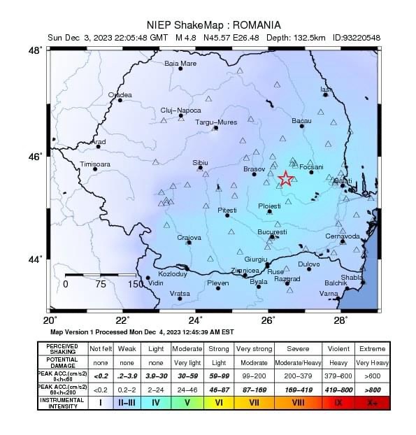 În ziua de 04.12.2023, 00:05:48 (ora României), s-a produs în ZONA SEISMICA VRANCEA, BUZAU un cutremur mediu cu magnitudinea ML 4.8, la adâncimea de 132.5 km.