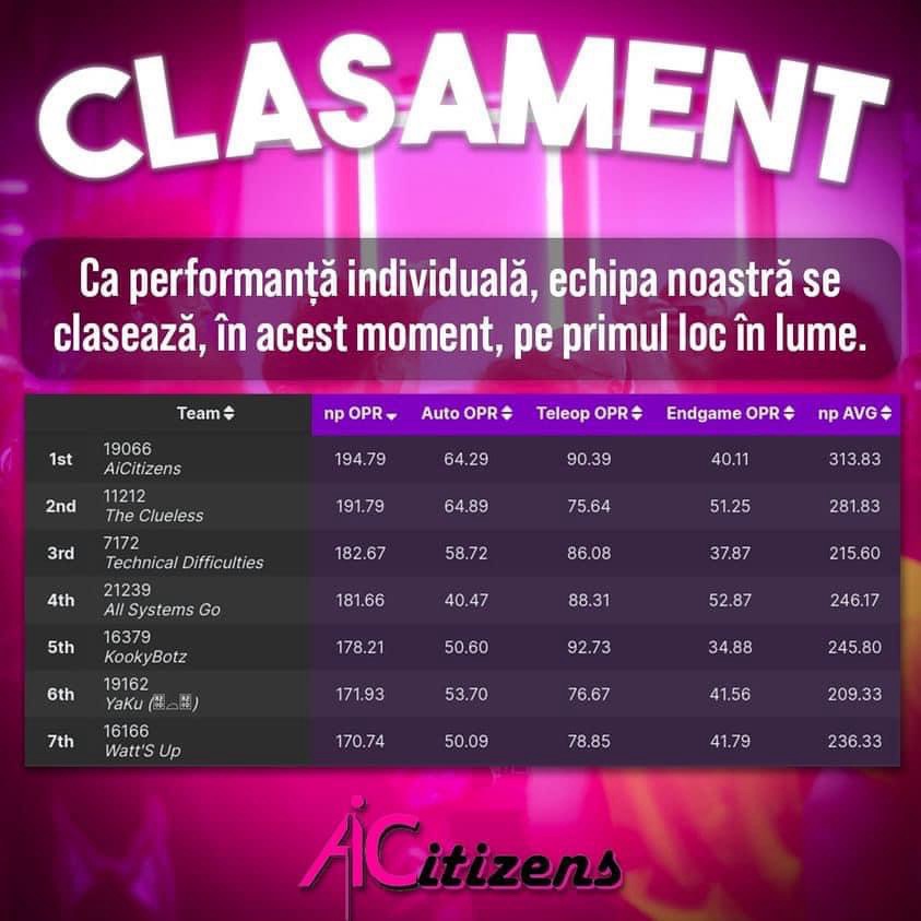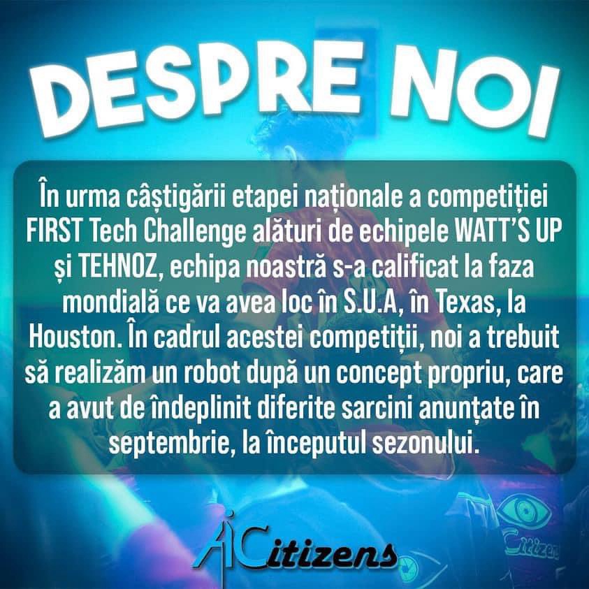 Echipa de robotică „AI Citizens” care se va deplasa la Campionatul Mondial din Houston este formată din 12 elevi: Irina Curcă, Elisa Elena Baciu, Petru Stoica, Raul Ștefan Bușilă, Marius Bogdan Hanu, Rami Stănilă, Cosmin Daniel Lupu, Călin Matei Sandu, Ștefania Găină, Rareș Costin Constantinescu, Bianca Maria Gorgan, Tudor Deian Bernovici, coordonați de profesorii îndrumători Tiberiu Oprea și Mihaela Victoria Oprea.