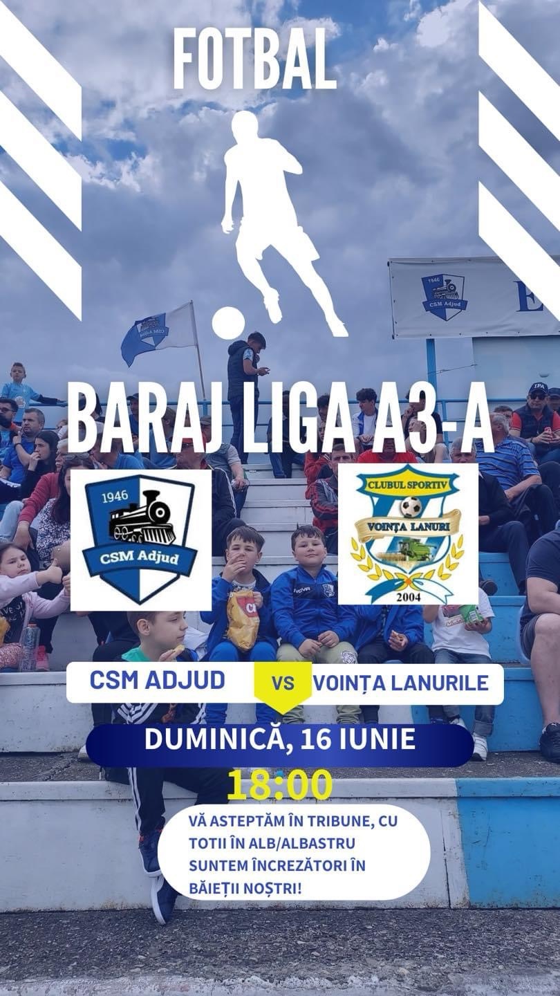 După promovarea echipei CSM 2007 Focșani în liga a doua, astăzi , fotbalul vrâncean se află în fața unei noi provocări. Campioana Superligii Vrancei, CSM Adjud va disputa prima manșă barajului de promovare în liga a treia.