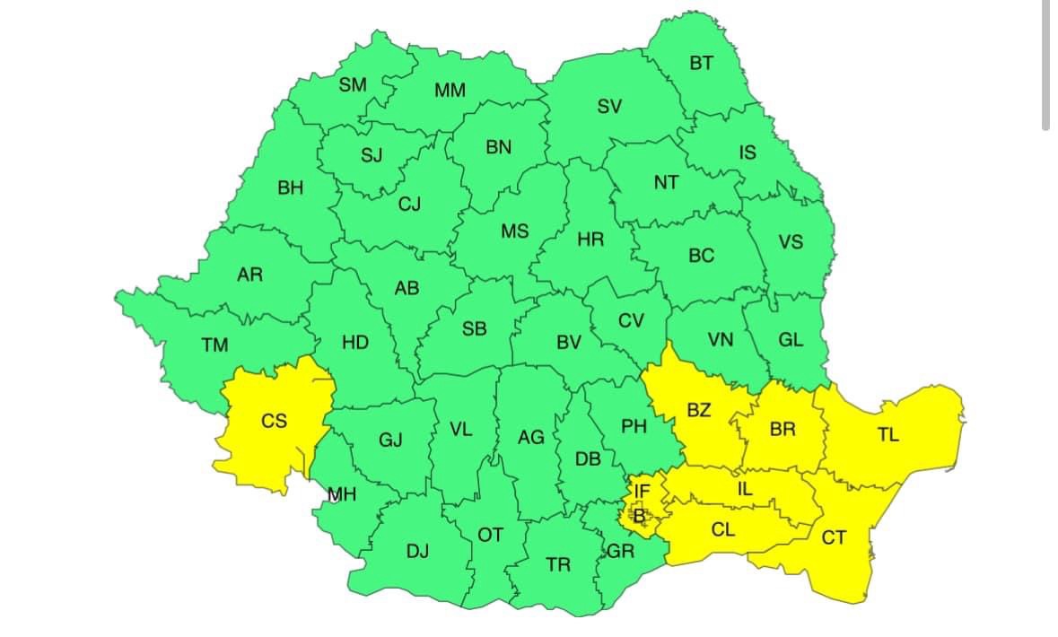 Zone afectate: Dobrogea, jumătatea estică a Munteniei și sudul Banatului În intervalul menționat, în Dobrogea, în jumătatea estică a Munteniei și în sudul Banatului vântul va avea intensificări, cu viteze la rafală de 50....55 km/h și temporar 60...65 km/h. Notă: Local și temporar vor fi intensificări ale vântului și în zona montană.