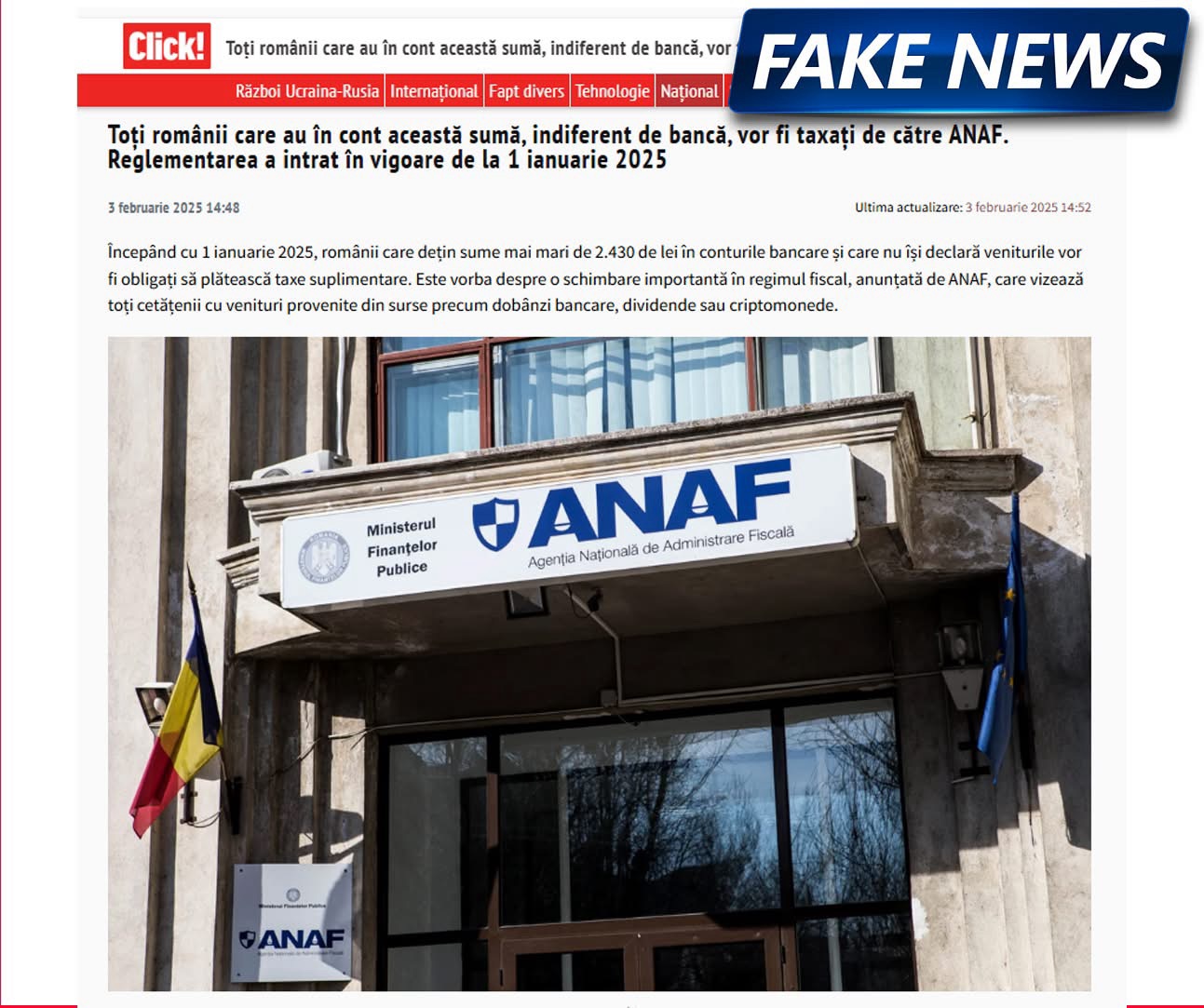 Cu privire la informațiile publicate de CLICK! în articolul cu titlul ”Toți românii care au în cont această sumă, indiferent de bancă, vor fi taxați de către ANAF.