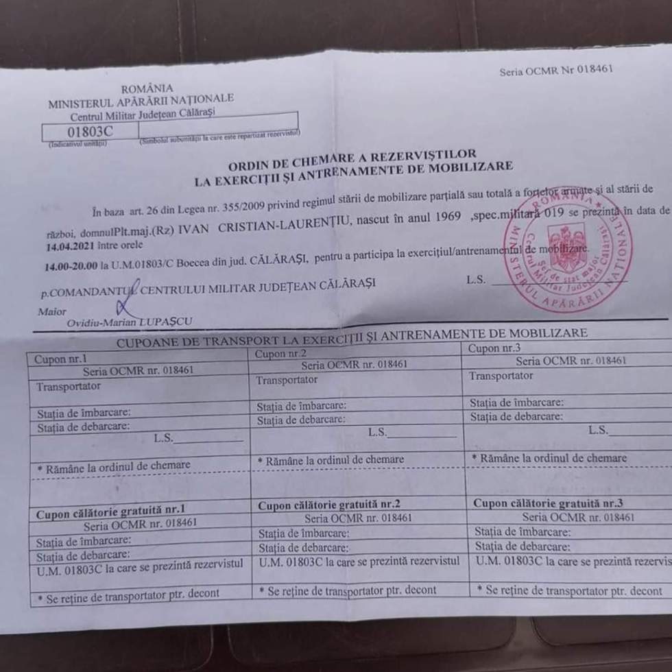 Ordin de chemare a rezerviştilor la exerciţii şi antrenamente de mobilizare