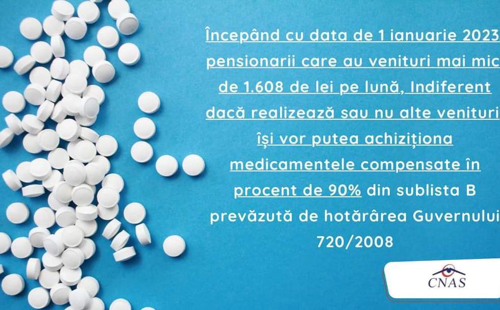 decembrie 31, 2022 Pensionarii cu venituri din pensii si indemnizatie sociala pentru pensionari de pana la 1.608 lei/luna inclusiv beneficiari ai programului pentru compensarea cu 90% a pretului de referinta a medicamentelor corespunzatoare denumirilor comune internationale Continuarea →